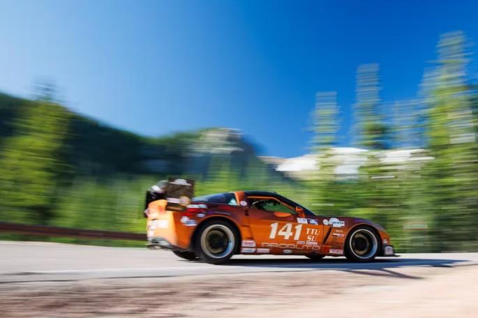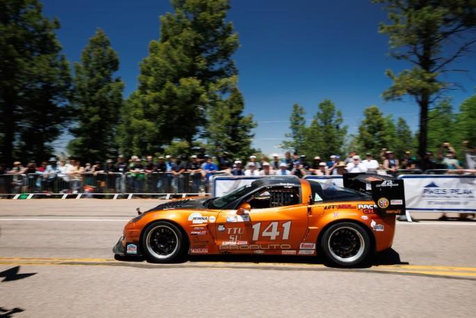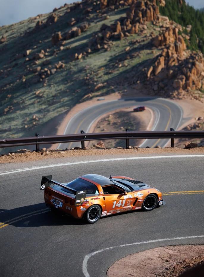 The Corvette needed several changes before it could make a practice run up the 14,115-foot peak, so Gaudu put together a list: replace the roll cage’s crossbars with NASCAR-style door bars; install a dash bar; mount an oxygen canister; add door pulls; install a Radium Engineering 14-gallon fuel cell. That last item is to help prevent starting a forest fire in the event of a crash, as stock fuel tanks aren’t always able to withstand a tumble down the side of a mountain…